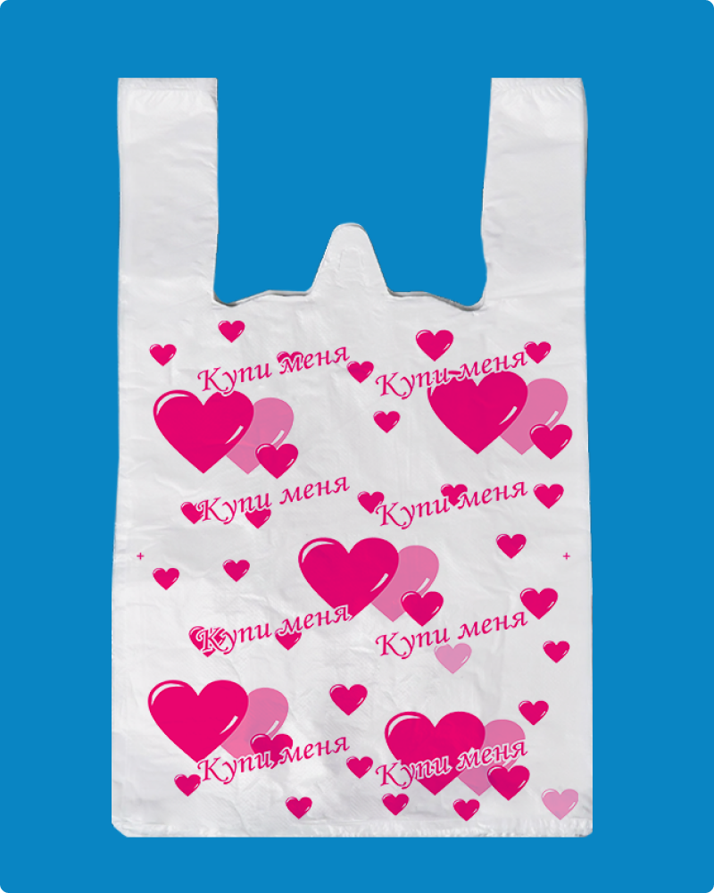 | Пакет-майка Купи меня из материала ПНД (полиэтилен низкого давления) имеет повышенную грузоподъемность, характерно шуршит при смятии. Увеличение внутреннего объема пакета происходит за счет фальцев. Петля позволяет удобно размещать пакеты-майки в кассовой зоне. Используется для упаковки пищевых и непищевых продуктов в супермаркетах, торговых точках прилавочного типа и точках общественного питания |