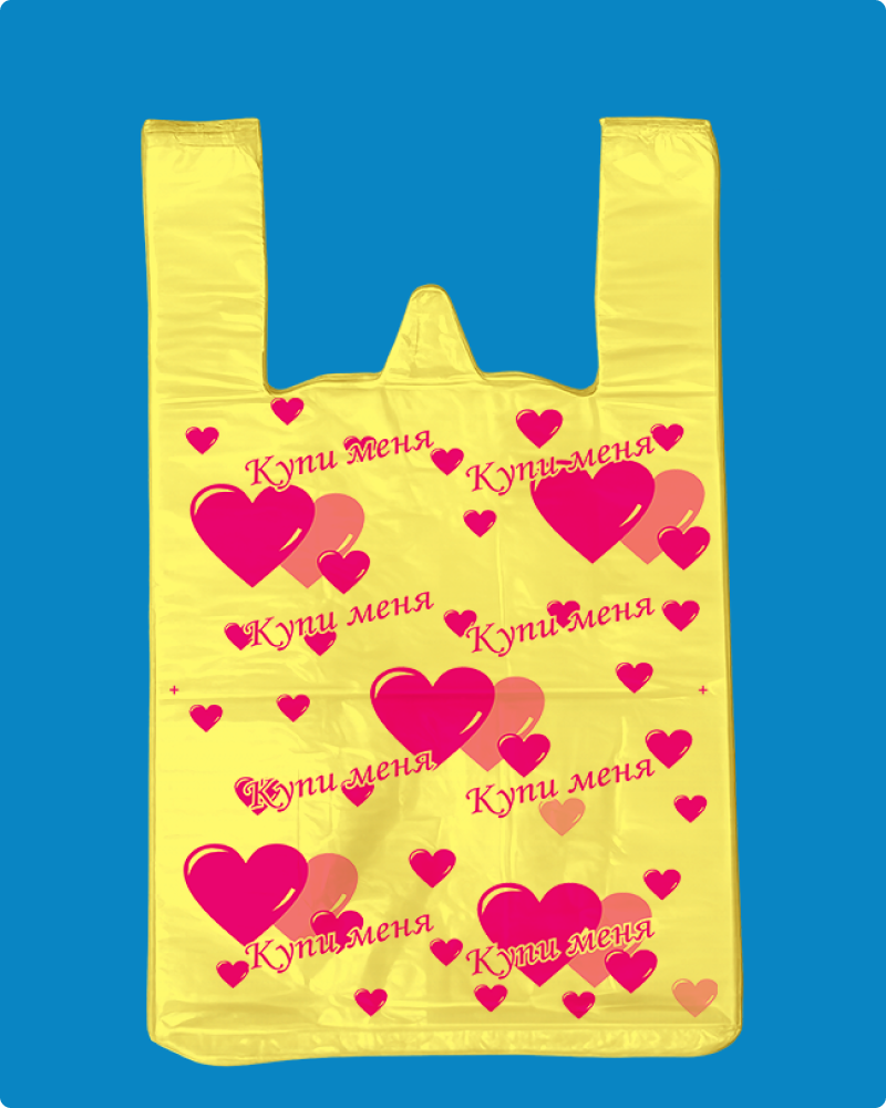 | Пакет-майка Купи меня из материала ПНД (полиэтилен низкого давления) имеет повышенную грузоподъемность, характерно шуршит при смятии. Увеличение внутреннего объема пакета происходит за счет фальцев. Петля позволяет удобно размещать пакеты-майки в кассовой зоне. Используется для упаковки пищевых и непищевых продуктов в супермаркетах, торговых точках прилавочного типа и точках общественного питания |