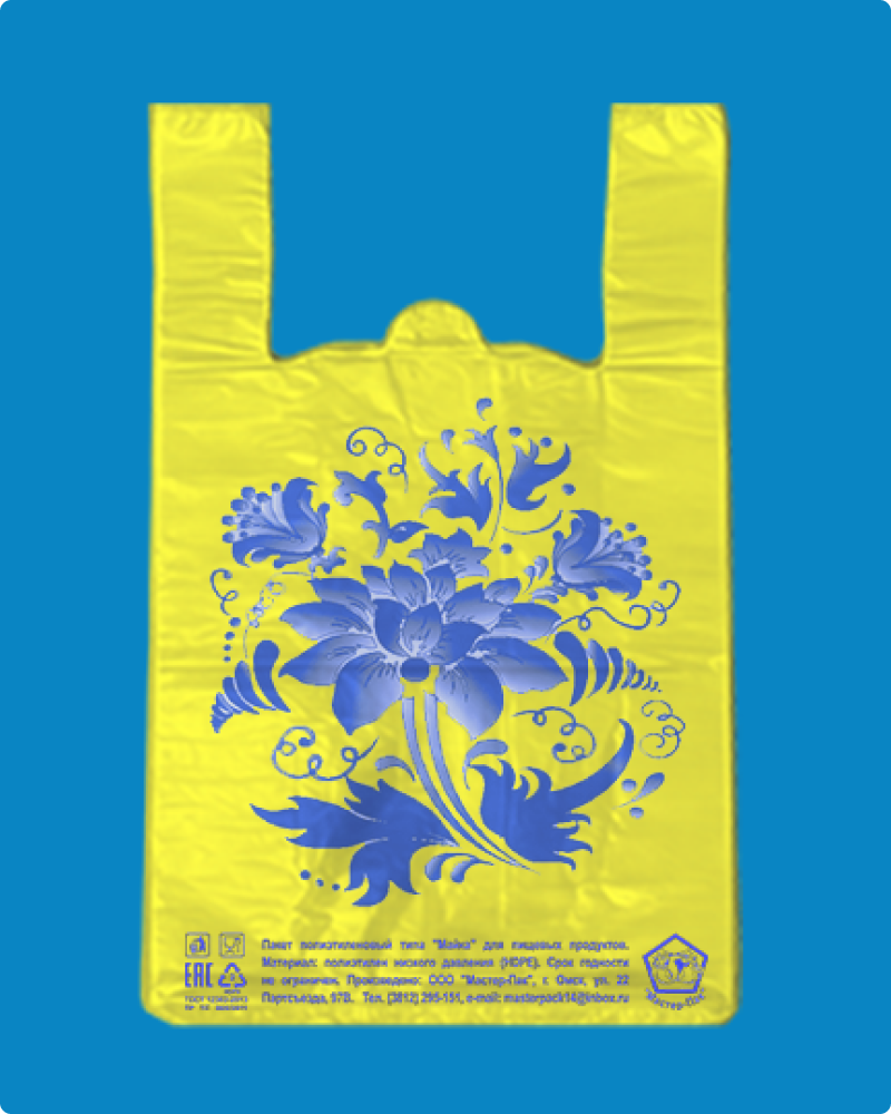 Пакет-майка Гжель из материала ПНД (полиэтилен низкого давления) имеет повышенную грузоподъемность, характерно шуршит при смятии. Увеличение внутреннего объема пакета происходит за счет фальцев. Петля позволяет удобно размещать пакеты-майки в кассовой зоне. Используется для упаковки пищевых и непищевых продуктов в супермаркетах, торговых точках прилавочного типа и точках общественного питания