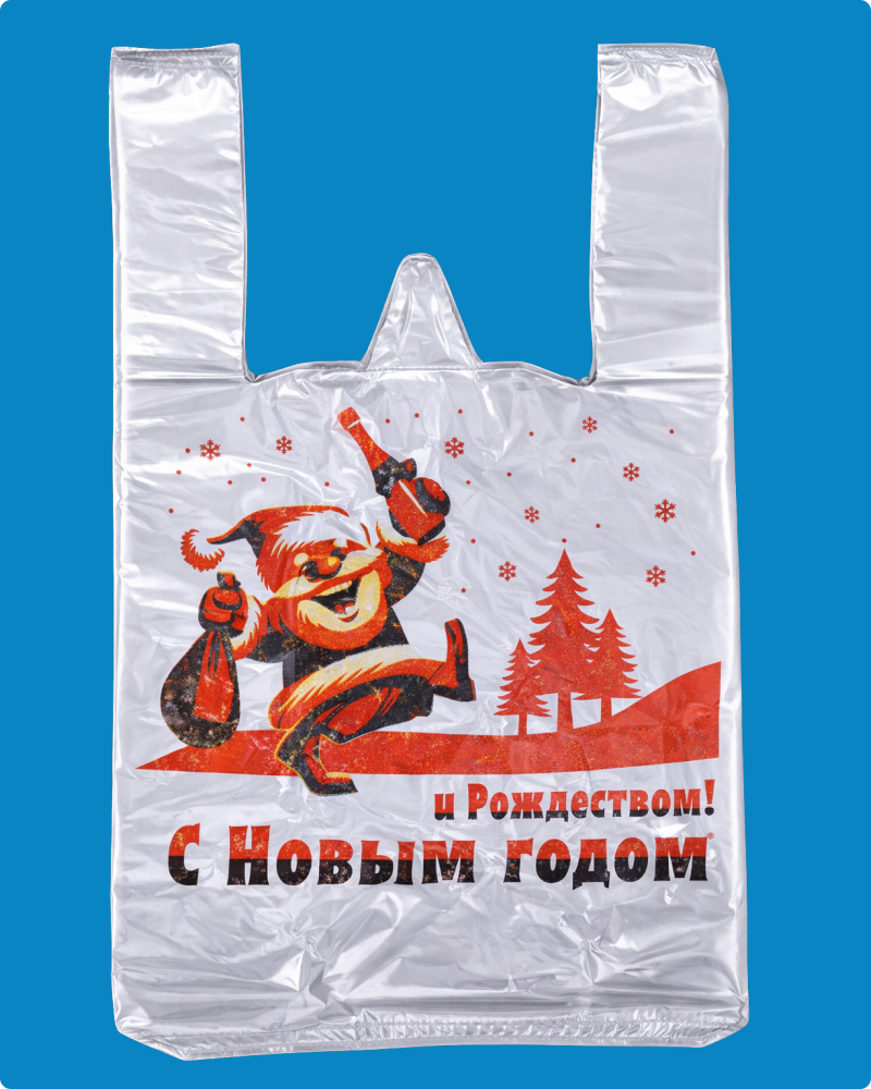 Новогодние пакеты-майки 30х55 см Веселый Дед Мороз из материала ПНД (полиэтилен низкого давления) прекрасно подчеркнут атмосферу долгожданного праздника – Нового года.
